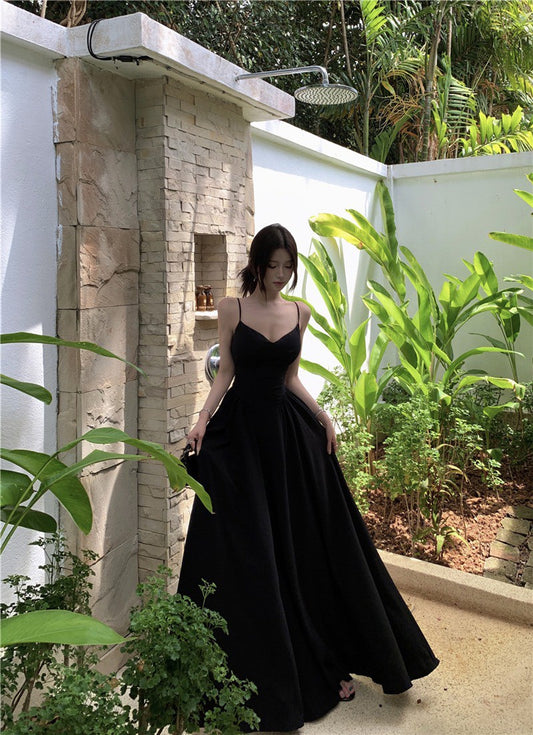 Na+ 復古大裙襬 度假V領交叉收腰連身裙 黑