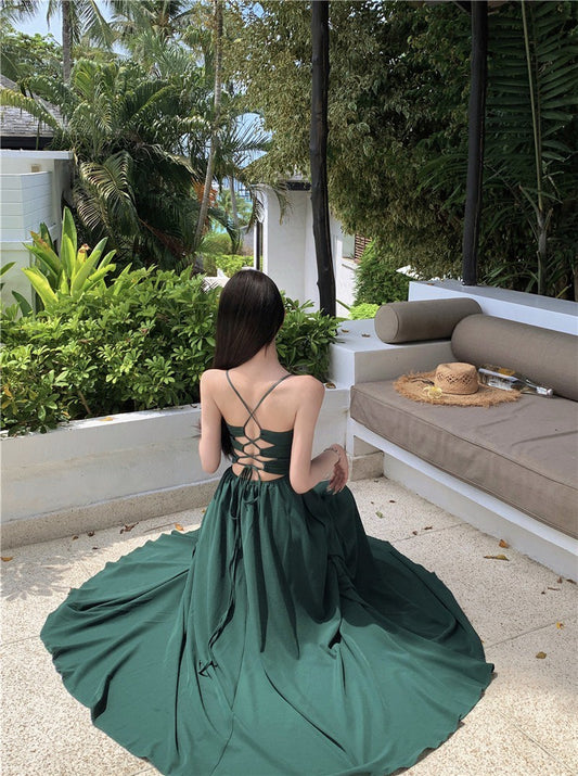 Na+ 復古大裙襬 度假V領交叉收腰連身裙 綠