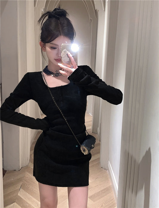 "Na+"復古甜辣 方領修身顯瘦長袖連身裙 短款
