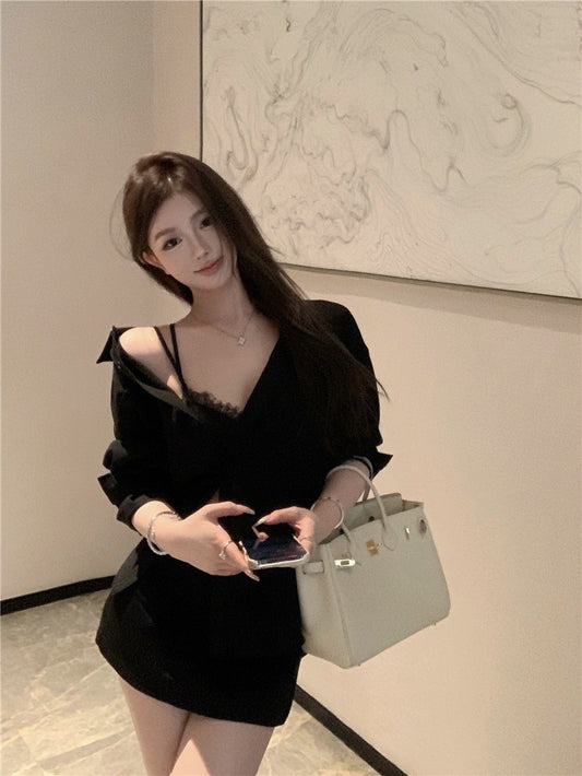 "Na+"法式高雅 氣質透紗純欲黑色連身裙 短款