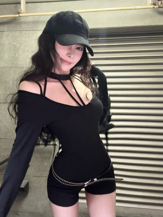 NA+ 性感小心機假兩件式綁帶上衣 咖/黑