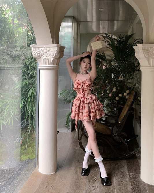 Na+ 復古玫瑰抽繩收腰馬甲蛋糕連身裙 紅印花