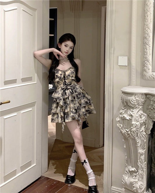 Na+ 復古玫瑰抽繩收腰馬甲蛋糕連身裙 黑印花