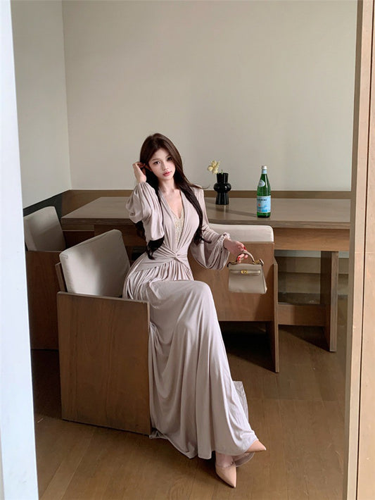 NA+ 淡香純慾蕾絲扭結拼接長款連身裙 奶茶