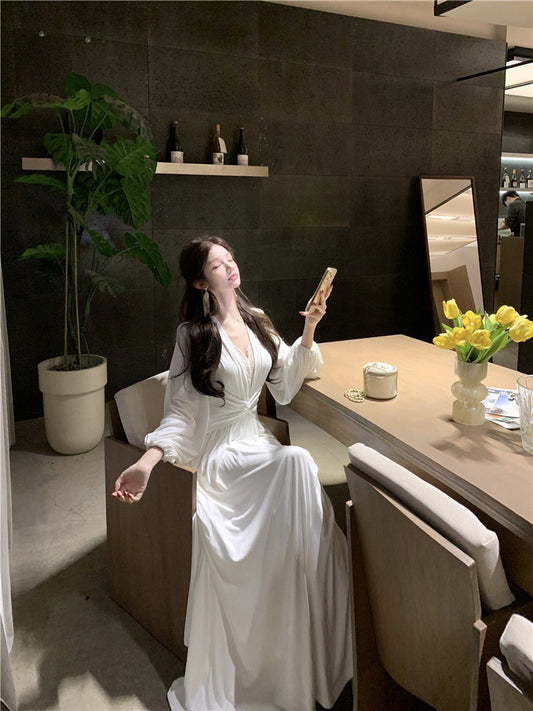 NA+ 淡香純慾蕾絲扭結拼接長款連身裙 白