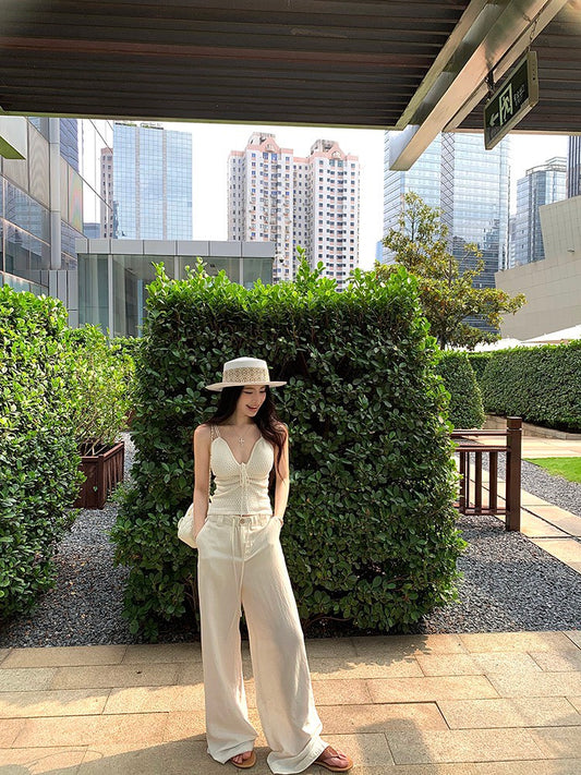 NA+ 華夫格鬆餅帶胸墊度假休閒背心 白 亞麻涼爽呼吸休閒褲