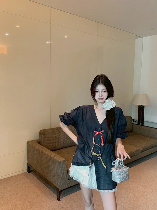 ''Na+''俏麗佳人 荷葉V領收腰顯瘦連身裙 黑