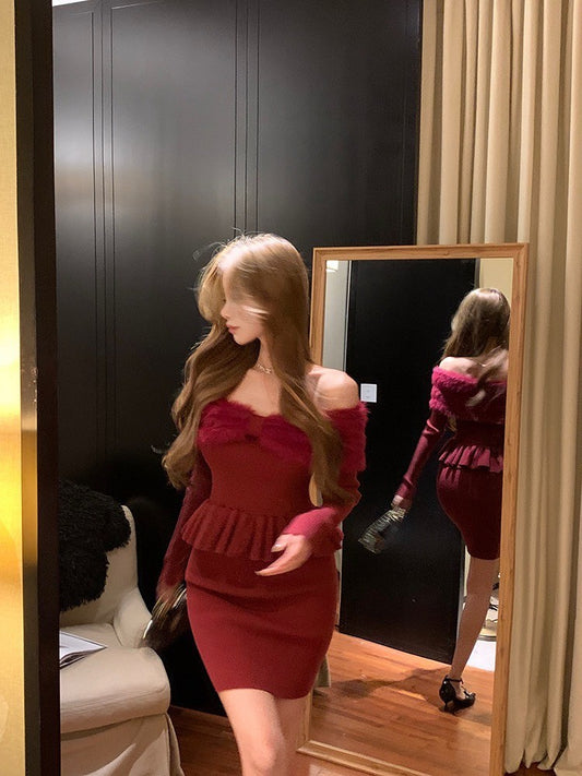 ''Na+''Alba蝴蝶水貂毛一字領針織上衣 半身裙