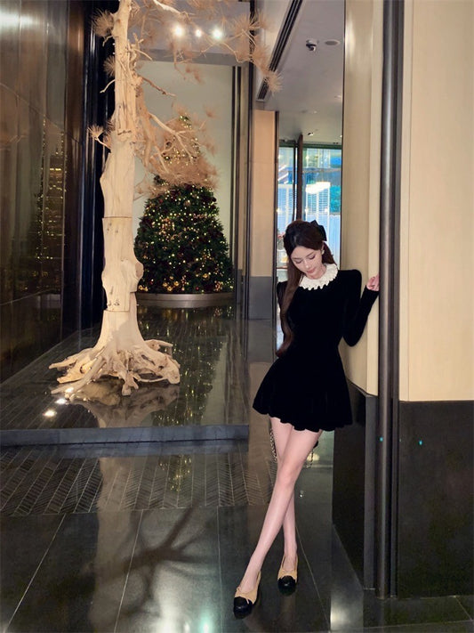 ''Na+''乖巧珍妮 法式赫本收腰花苞絲絨連身裙 黑