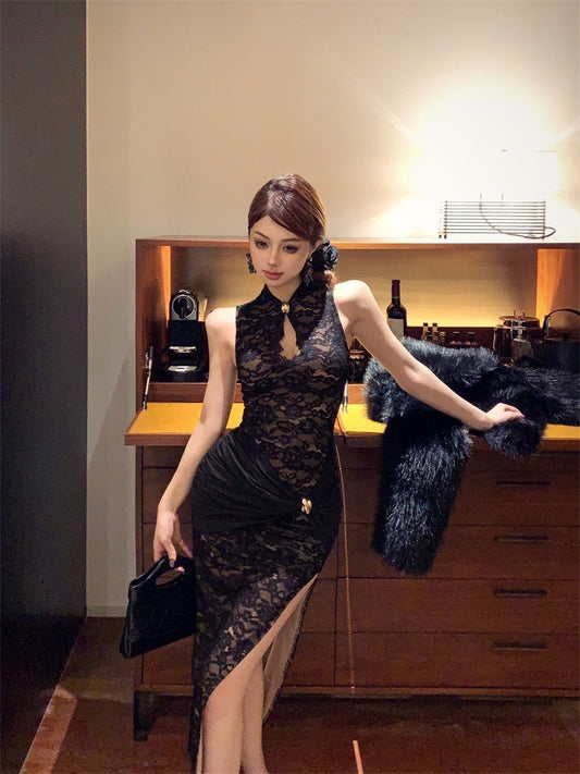 ''Na+''中式女郎 旗袍盤扣高開叉緹花連身裙 黑