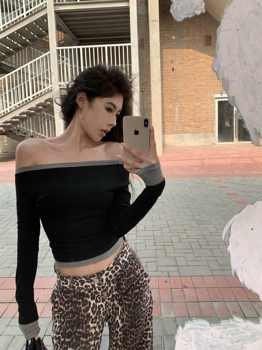''Na+''不分季節當辣妹 撞色包邊一字領彈力上衣 黑/深灰