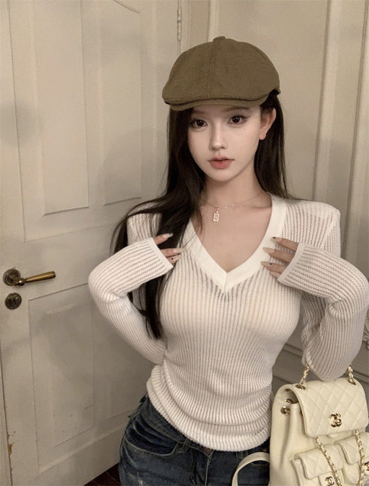 ''Na+''休閒百搭 V領網眼針織上衣 米/卡其 中腰半身裙