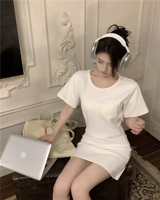 Na+ 鬆弛感收腰口袋T shirt裙 白/黑