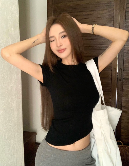 【Na+】24年度好身材穿搭 簡約純色黑上衣 低腰彈力灰色長褲