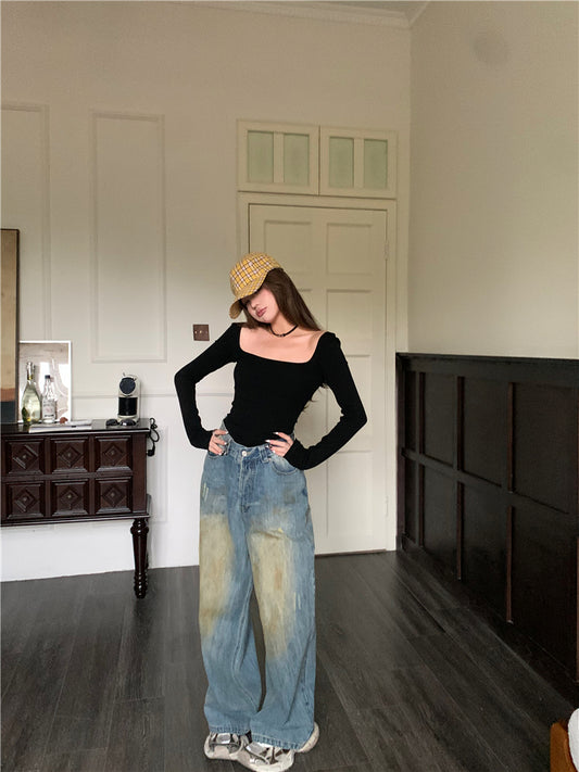 【Na+】復古做舊髒髒風老爺褲 方領顯瘦上衣