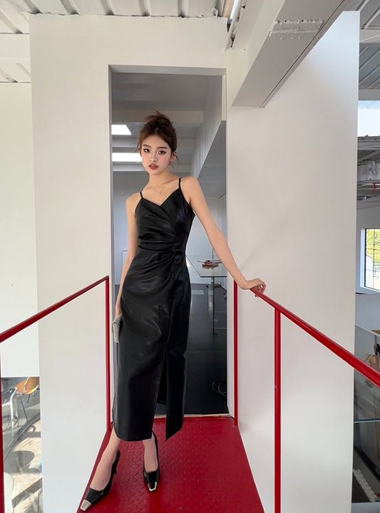 【Na+】御姐風 皮革交錯設計吊帶連身裙