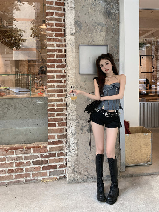 【Na+】復古拉鍊設計感 牛仔抹胸馬甲