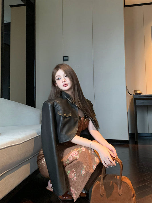 【Na+】復古美式 仿舊霧感皮外套 辣妹半身裙