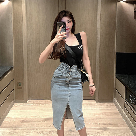 【Na+】日常百搭排扣高腰開叉牛仔裙