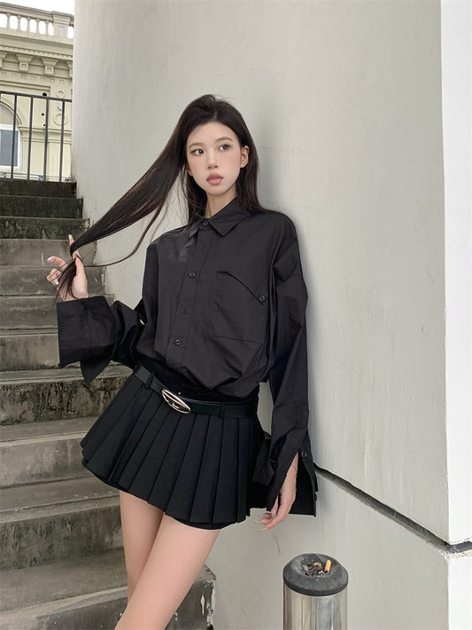 【Na+】日常百搭 慵懶口袋襯衫 百摺裙 黑
