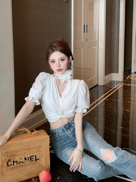 【Na+】泡泡袖紐結顯瘦v領上衣 白