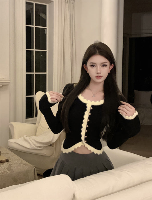 【Na+】法式花邊水貂毛拼接喇叭袖針織上衣