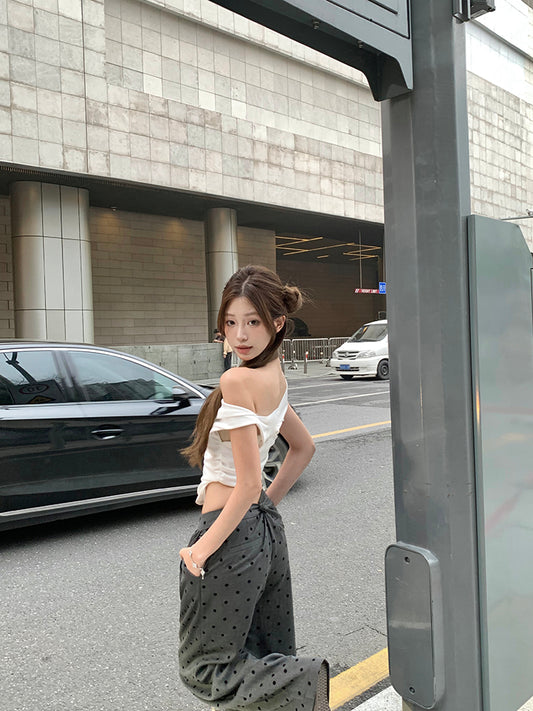 【Na+】白色仙女不規則設計上衣 波點休閒褲