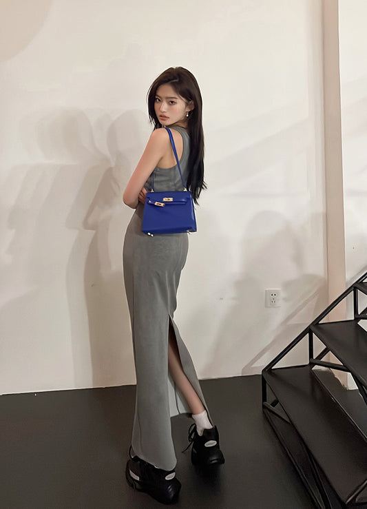 【Na+】百搭不規則吊帶連身裙 灰