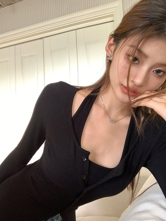 【Na+】漫畫腰 顯瘦假兩件式背心上衣 黑