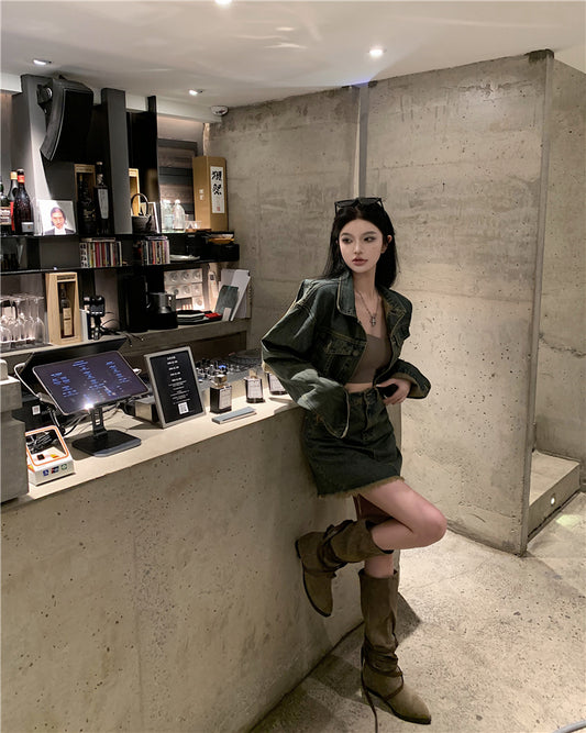 【Na+】炸街復古毛邊做舊黃調牛仔2件套