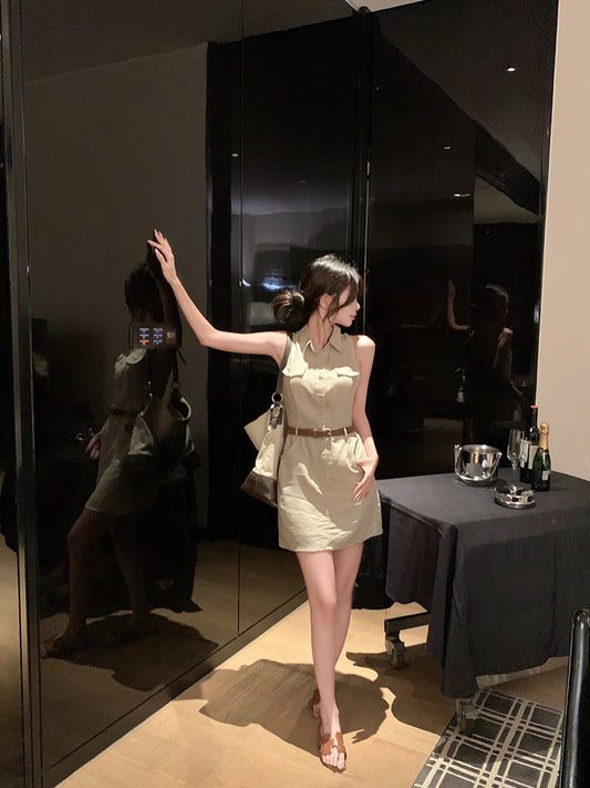 ''Na+''女神雅典娜 蕩領飄帶美背連身裙 卡其