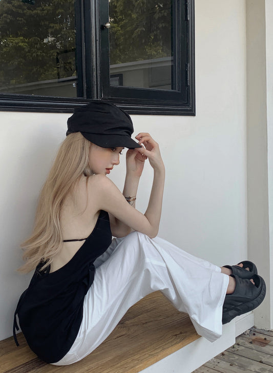 【Na+】辣妹露背可綁帶上衣 白色薄款休閒褲