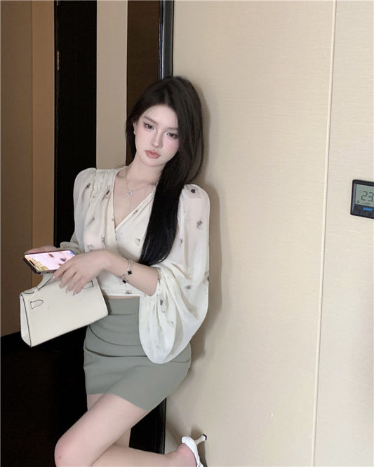 【Na+】通勤氣質水墨印花雪紡上衣 豆沙綠半身裙