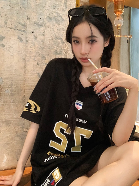 【Na+】運動少女系列 美系v領球衣短袖上衣 黑