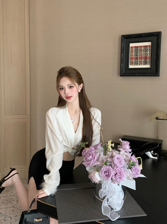 【Na+】高級感御姐 紐結顯瘦毛毛袖襯衫 白