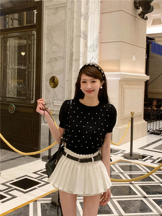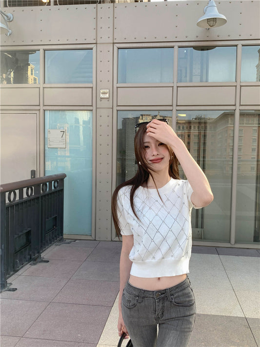 【Na+】韓系氣質釘珠圓領針織上衣 白