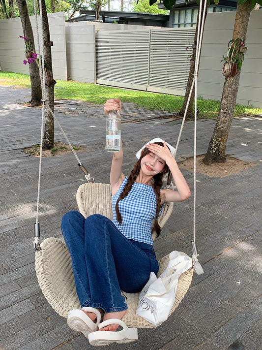 【Na+】韓系鄉村氛圍 格紋綁帶露背上衣