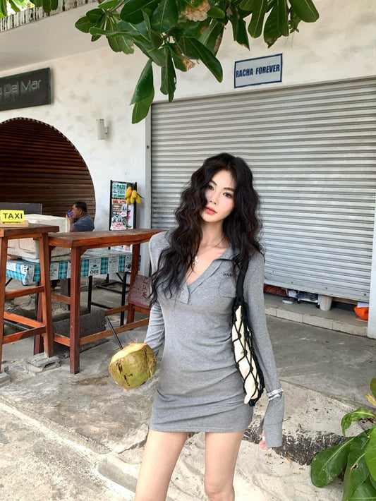NA+ SO HOT辣妹polo領彈力連身裙 灰/藏藍