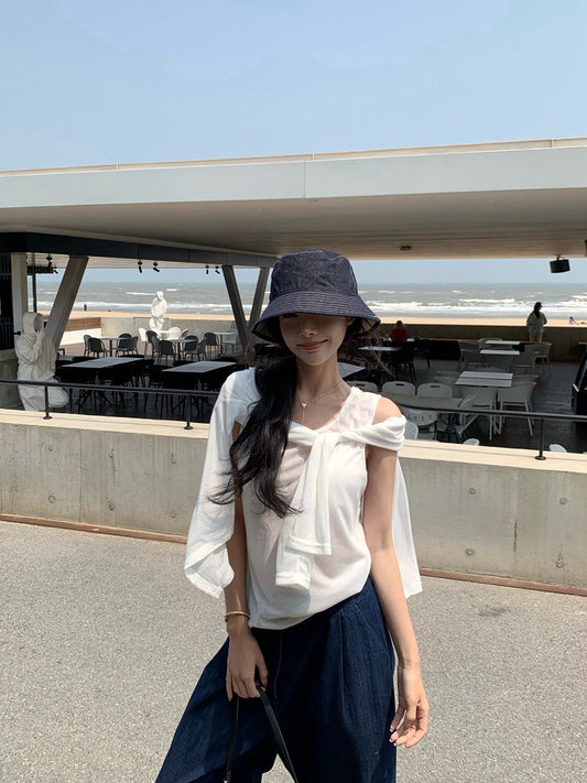 NA+ 簡約斜肩立體花邊拼接上衣 白/藏青