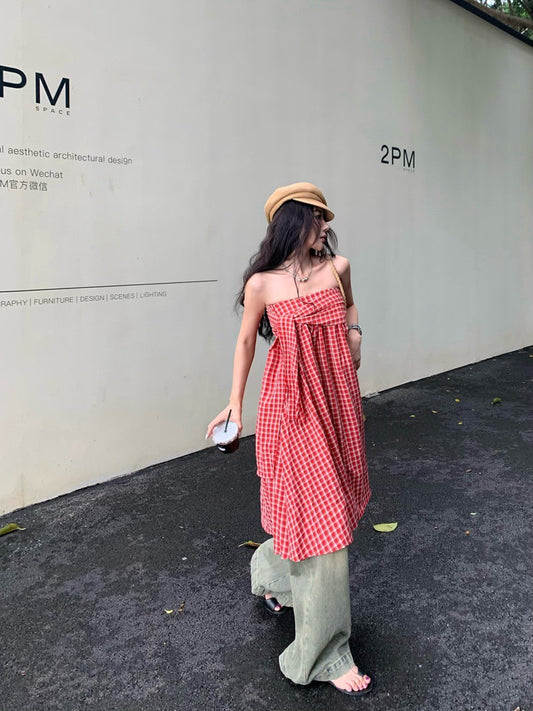 NA+ 野餐計畫3穿中長紅格紋連身裙