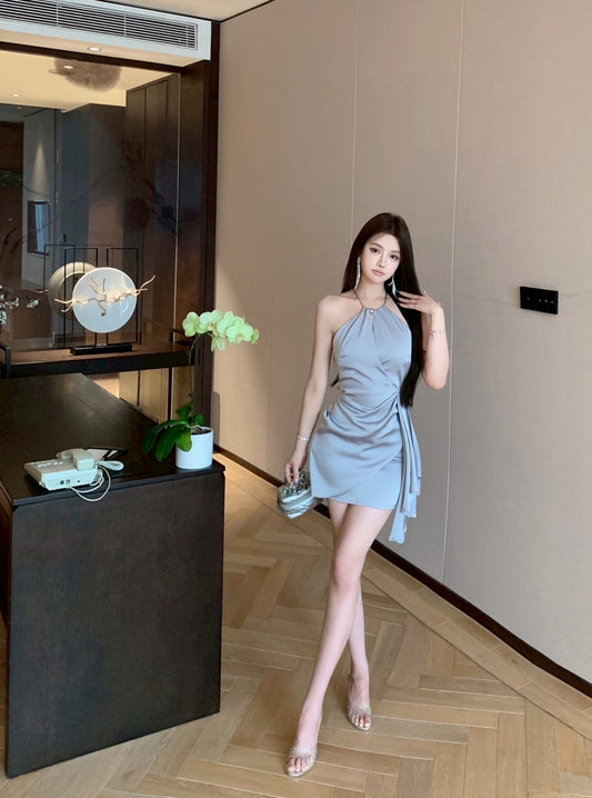 NA+ 獵殺極品高級掛脖繫帶緞面連身裙 灰
