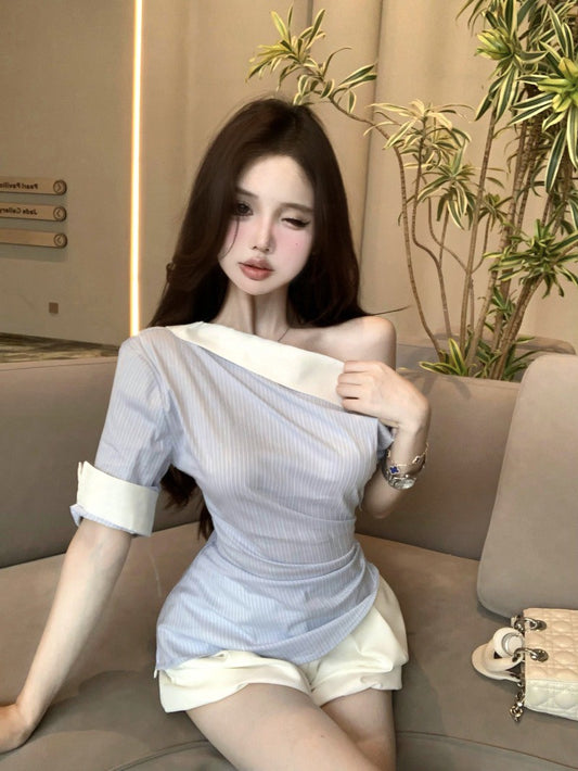NA+ 通勤斜肩拼色條紋襯衫 白色花苞褲