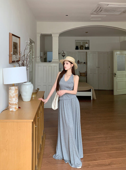 NA+ 簡約純色棉質掛脖露背上衣 休閒半身裙 灰/黑