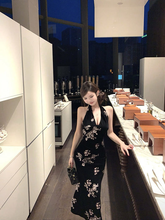 NA+ 晚意天香V領修身絲絨印花連身裙