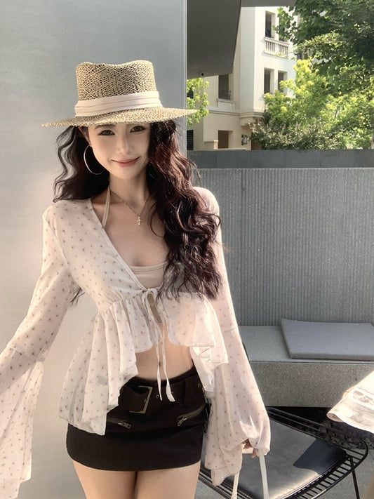 NA+ 花紗雪紡渡假休閒高腰綁帶罩衫
