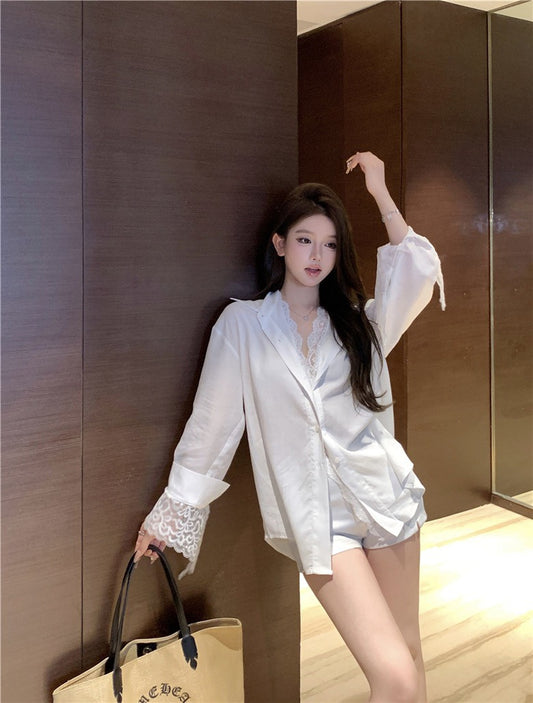 NA+ 純色蕾絲百搭夾兩件拼接襯衫