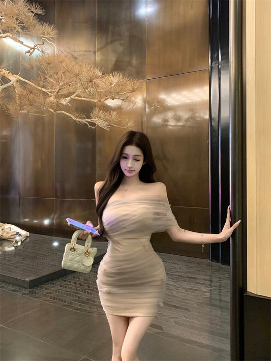 Na+ 迷霧美人單肩手工花網紗包臀裙