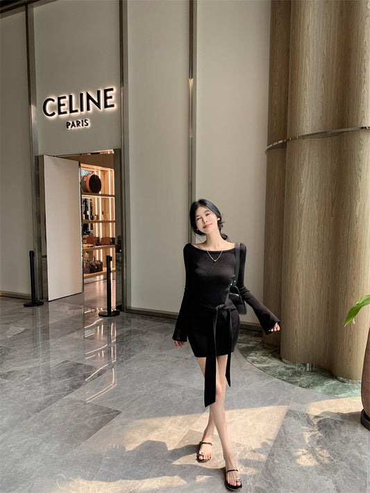 ‘’Na+’’紐約女伶 秋冬針織修身綁帶喇叭袖包臀裙 米色/黑色