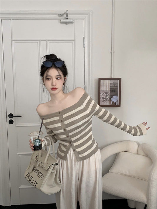 "Na+"街邊coffee 氣質一字領針織橫紋撞色上衣 藍/奶綠