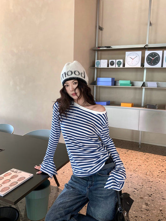 NA+ 慵懶隨性條紋喇叭袖上衣 藍條/黑條